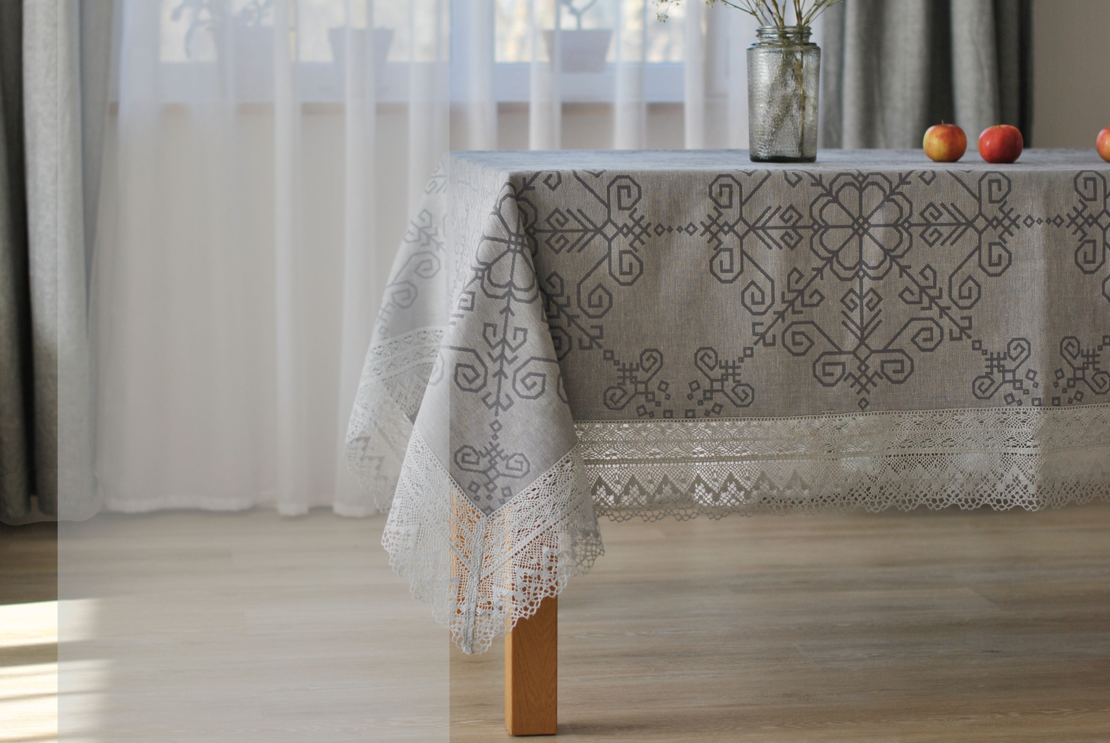 Lina galdauts ar platu mežģīni ar Saules rakstu, pelēks