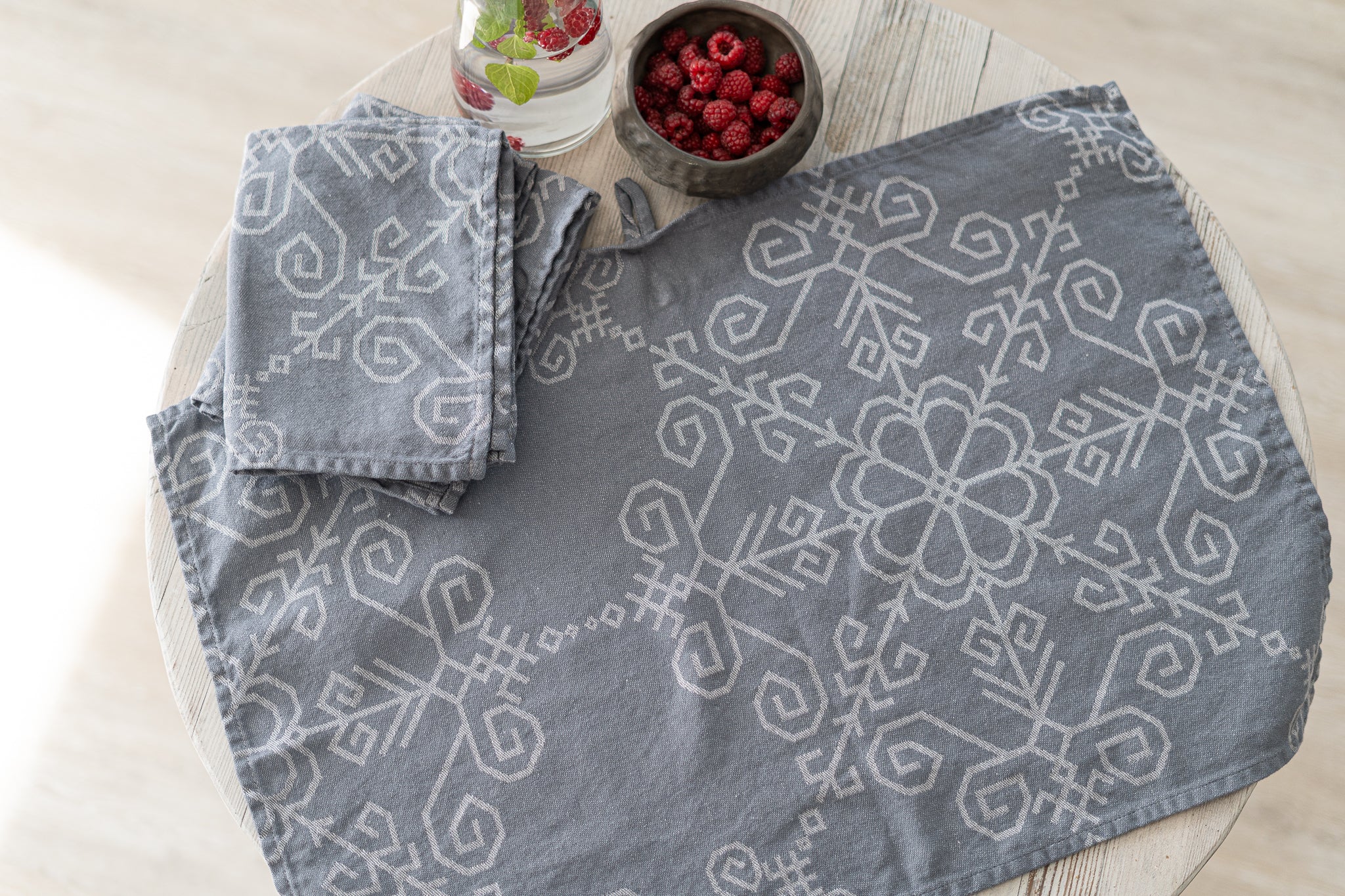 Ūdeni atgrūdošs abpusējs galdauts ar Saules rakstu, pelēks