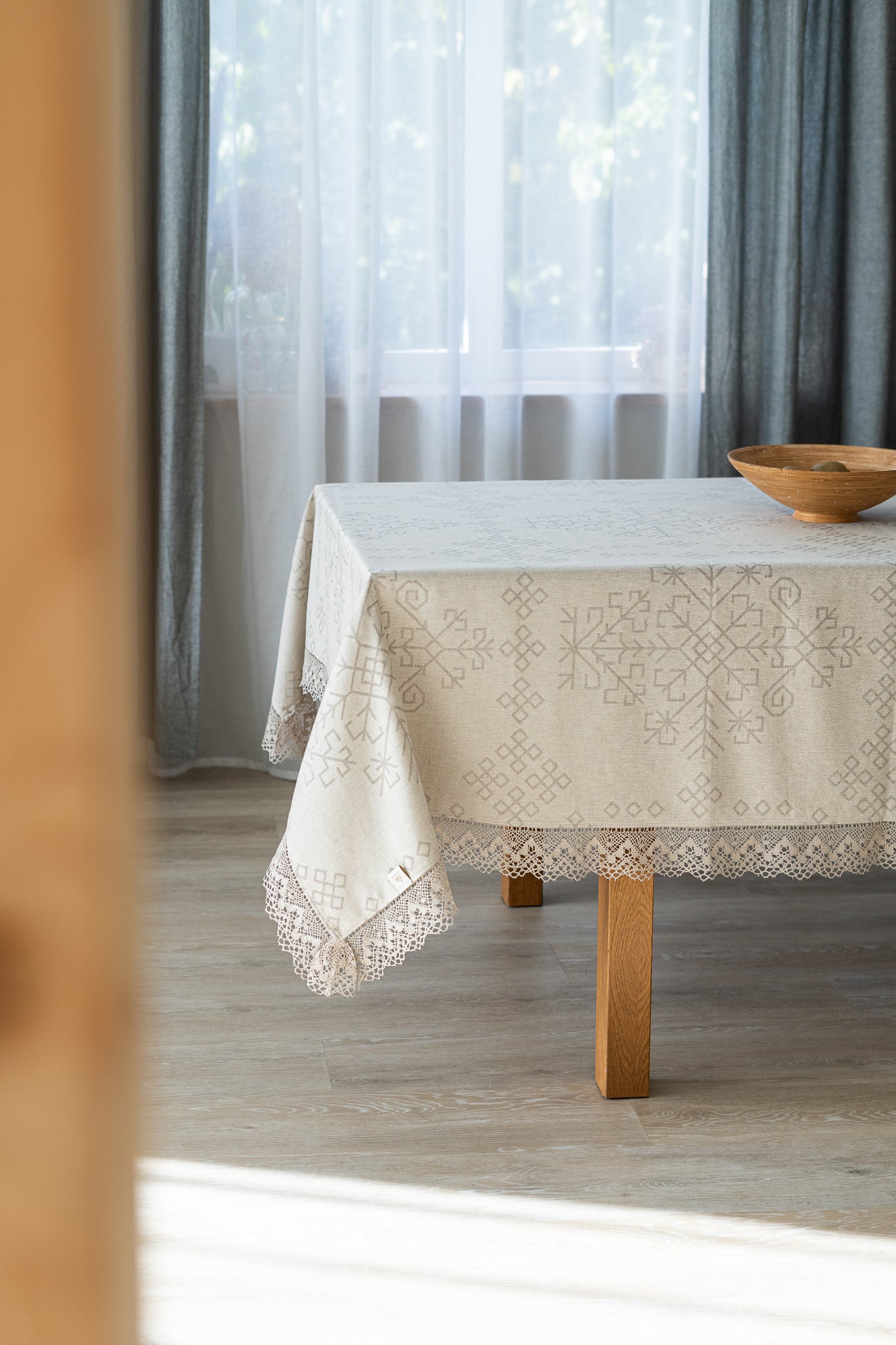 Ūdeni atgrūdošs abpusējs galdauts ar Austras koka rakstu, naturāls