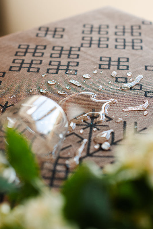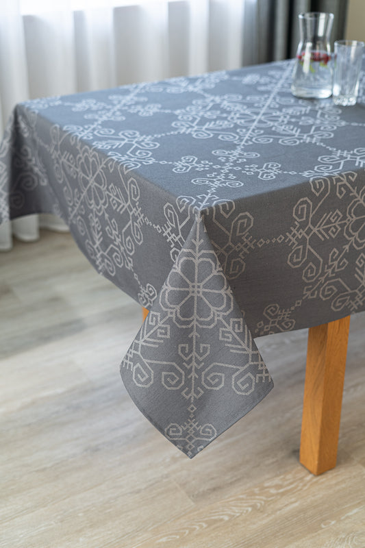 Ūdeni atgrūdošs abpusējs galdauts ar Saules rakstu, pelēks