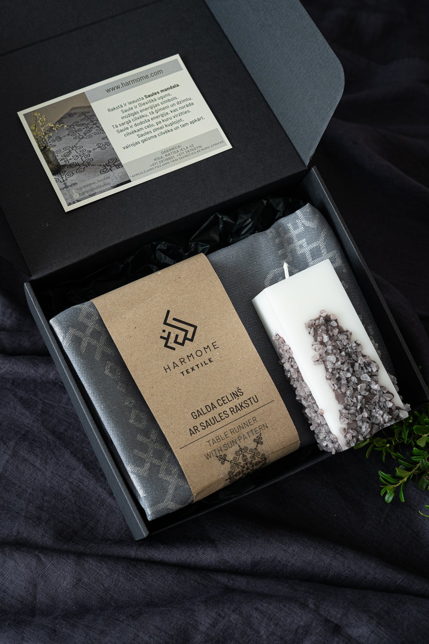 Pelēks galda celiņš ar Saules rakstu / Svece ar sāli