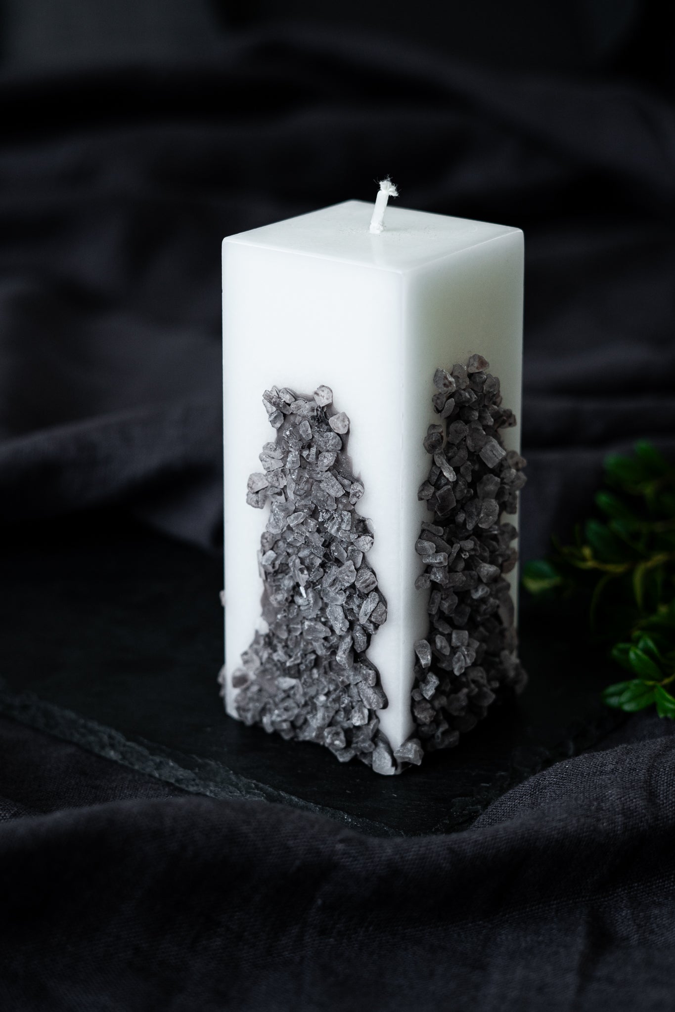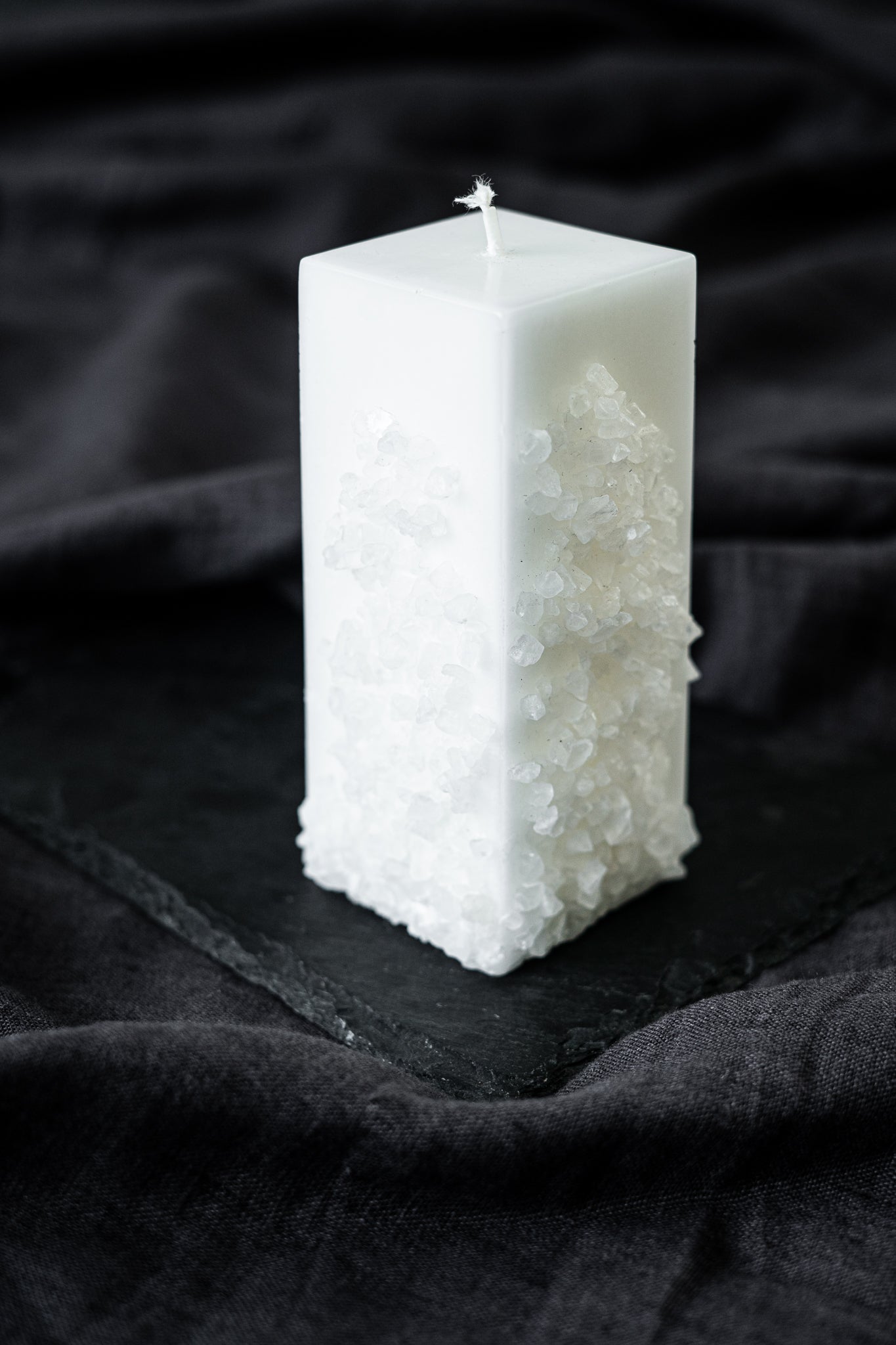 Eko stearīna svece ar sāli. Stearīna sveces ir ekoloģisks un dabīgs produkts. Sāls enerģētiski attīra telpu.